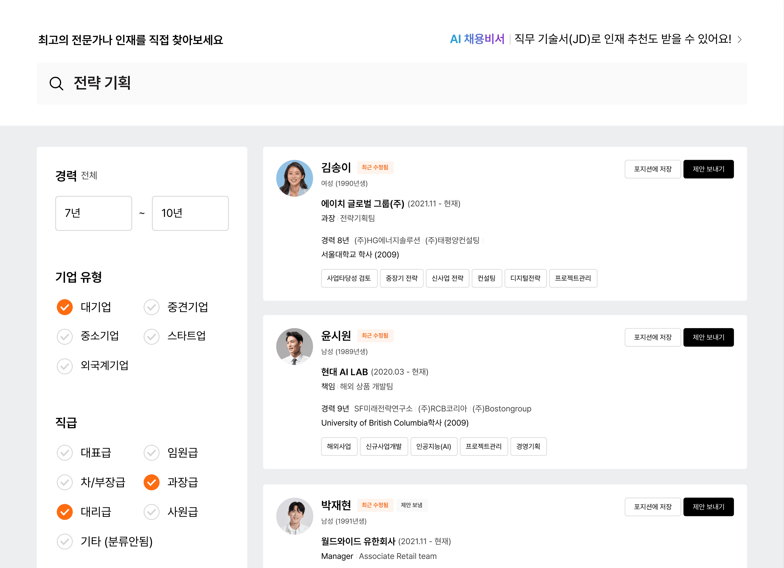 리멤버 인재검색 페이지에서는 다양한 필터를 활용해 원하는 조건의 인재 검색이 가능하다.